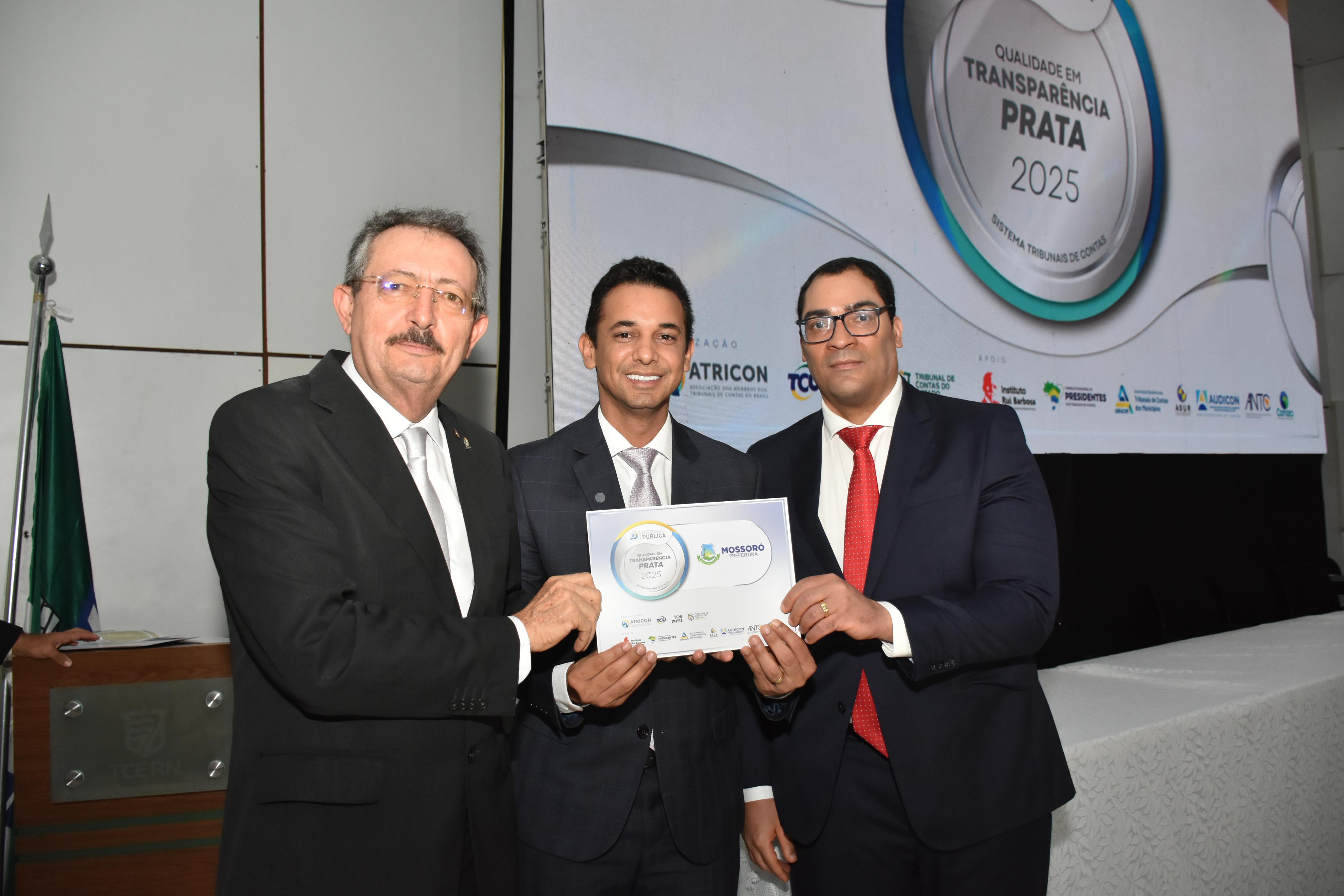Representando a Prefeitura de Mossoró, o prefeito Allyson Bezerra (UB) recebeu nesta sexta-feira (12), o Selo Prata de Qualidade em Transparência Pública. A premiação foi entregue pelo Tribunal de Contas do Estado do Rio Grande do Norte (TCE/RN), em solenidade no próprio TCE/RN, em Natal.