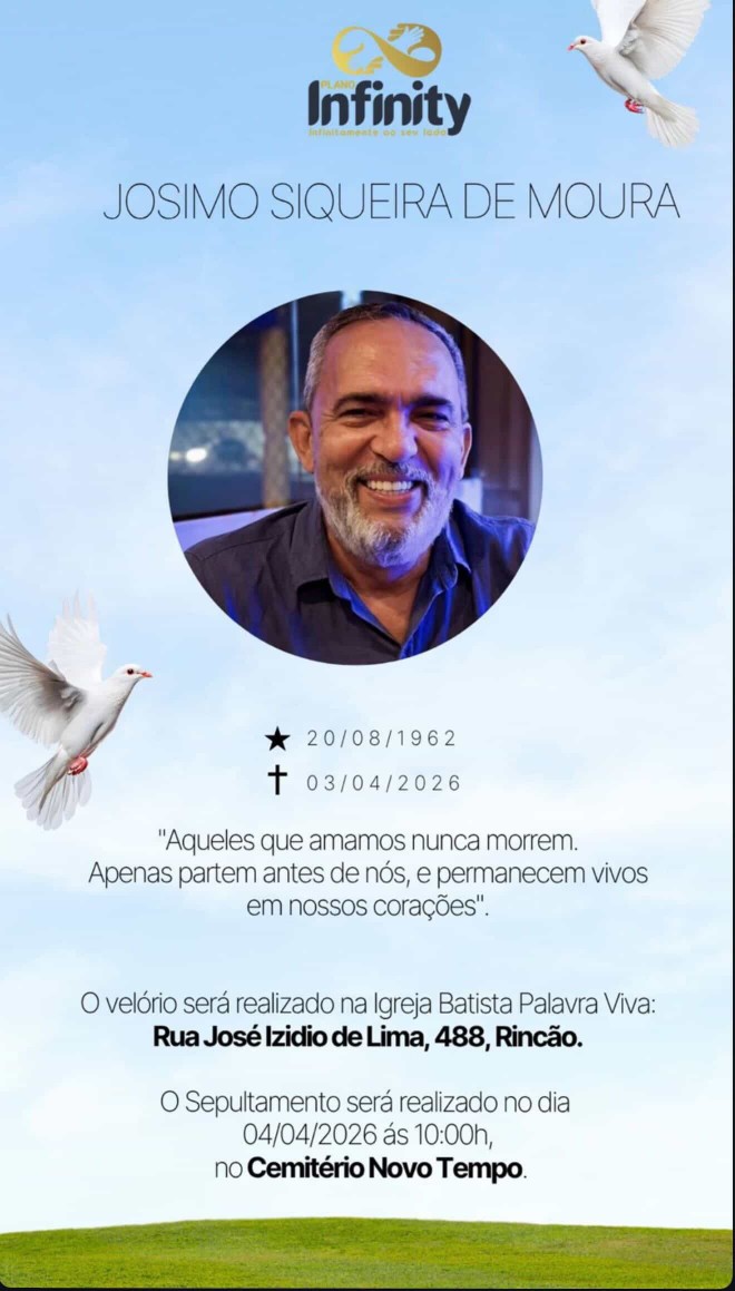 Registramos o falecimento na manhã desta sexta-feira (03), de Jósimo Siqueira de Moura, 63. Estava em sua residência, em Mossoró, quando foi vítima de infarto.