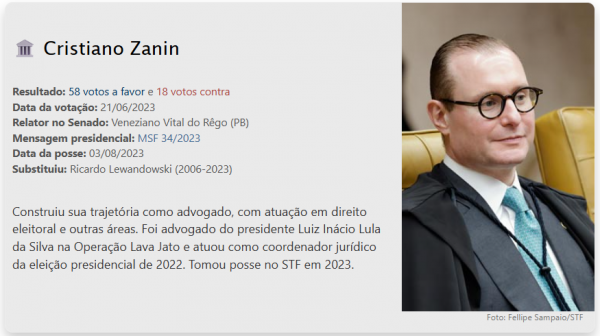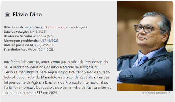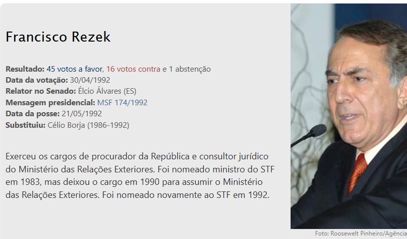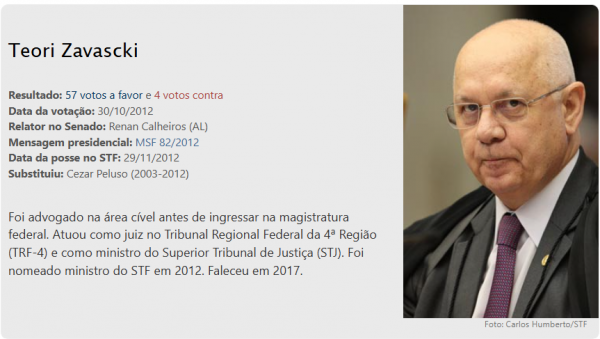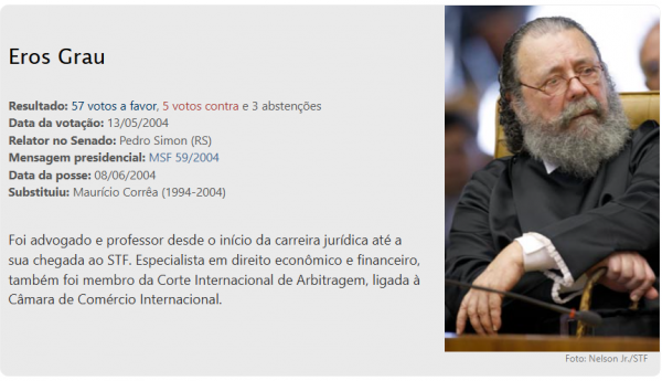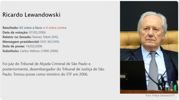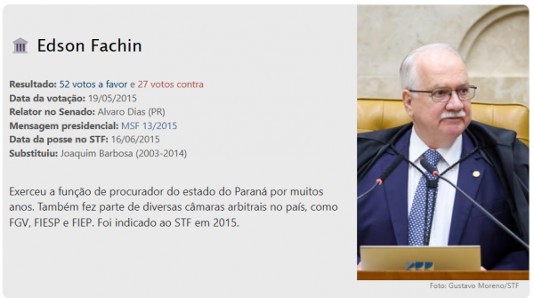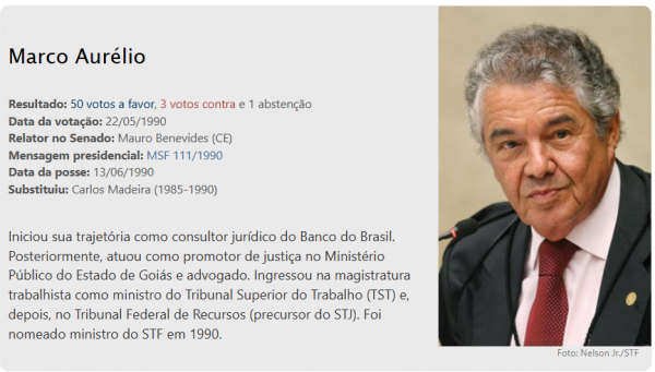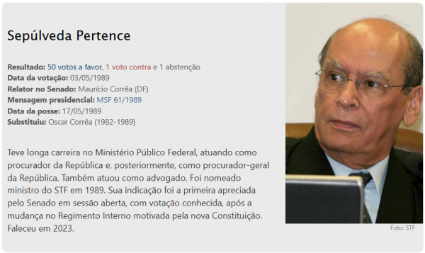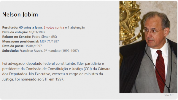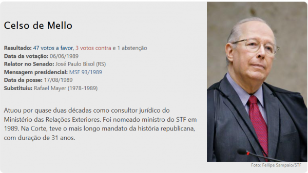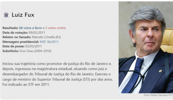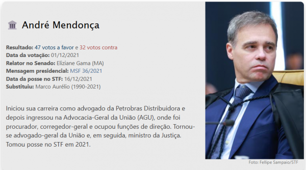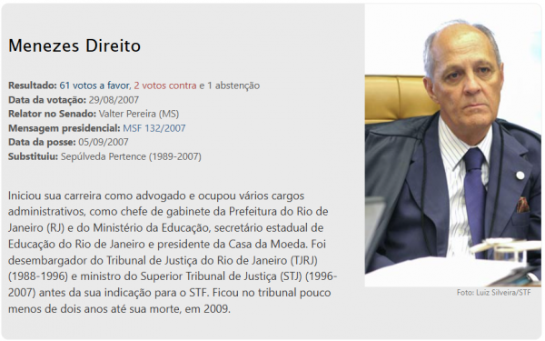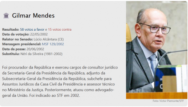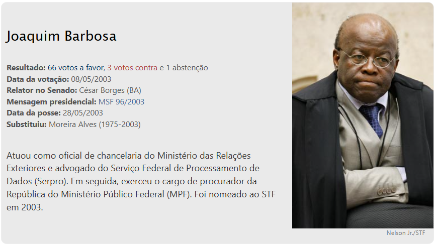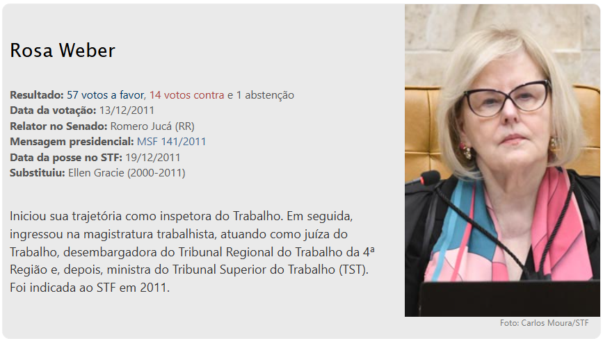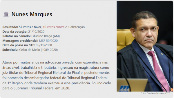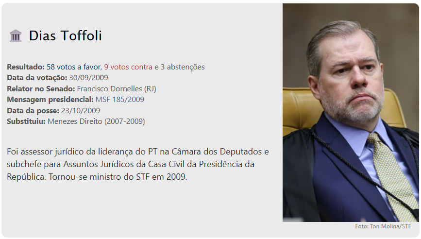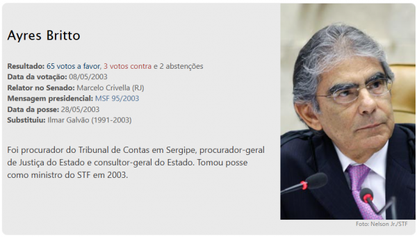 Em cada perfil abaixo estão reunidas informações como relatoria, sabatina e resultado da votação, além de um resumo biográfico de cada ministro. É um trabalho documental muito interessante à cobertura do jornalismo político, operadores do direito e outros interessados no assunto.
