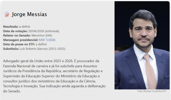 O nome que está agora nesse processo de iminente aprovação para se tornar integrante do STF, é do atual Advogado-Geral da União (AGU), Jorge Messias. Nesta postagem editada (ufa!) pelo BCS, a partir de produção da Agência Senado, a gente mostra um histórico das indicações e nomeações, a partir do governo do presidente José Sarney (1985-1990).