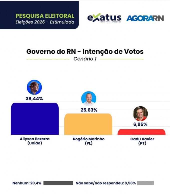 Em um primeiro cenário, Allyson Bezerra aparece com 38,44%. Em segundo lugar, está o senador Rogério Marinho (PL), com 25,63%. O terceiro colocado é o secretário de Fazenda do RN, Cadu Xavier (PT), que tem 6,95%. Um total de 8,58% dos eleitores disseram não saber em quem votar. Já 20,4% responderam que não pretendem votar em ninguém.