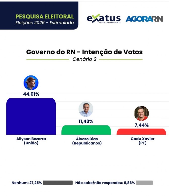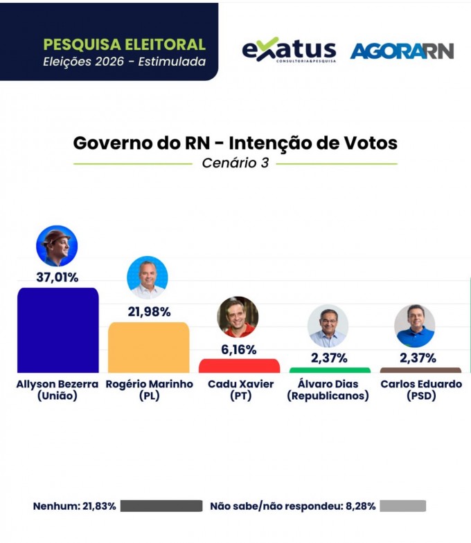 O jornal impresso e portal virtual Agora RN, de Natal, na edição desta sexta-feira (28), apresentou mais uma rodada de pesquisa eleitoral ao Governo do RN, através do Instituto Exatus. O prefeito de Mossoró, Allyson Bezerra (União), segue liderando a corrida para o Governo do Estado nas eleições de 2026.