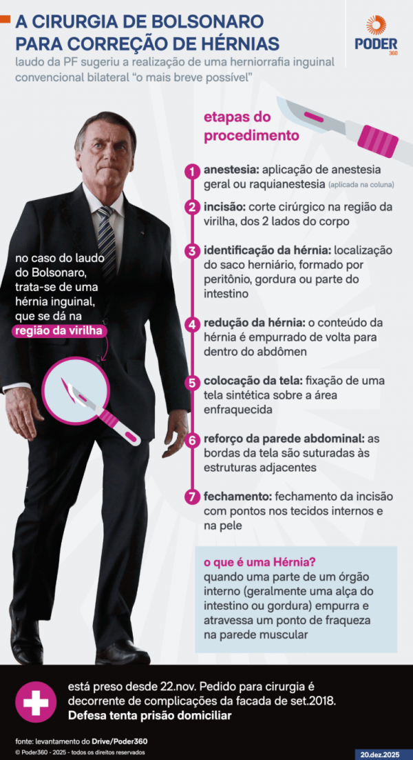 Segundo eles, com a recuperação do pós-operatório, Bolsonaro só deve ter alta de 5 a 7 dias depois do procedimento. O ex-presidente está internado para realizar cirurgia de hérnia inguinal bilateral, autorizada pelo Supremo depois da manifestação favorável da PGR (Procuradoria Geral da República). Bolsonaro saiu da Superintendência da Polícia Federal, em Brasília, na manhã desta 4ª feira (24.dez.2025), véspera de Natal, e está internado no Hospital DF Star para realizar o procedimento.