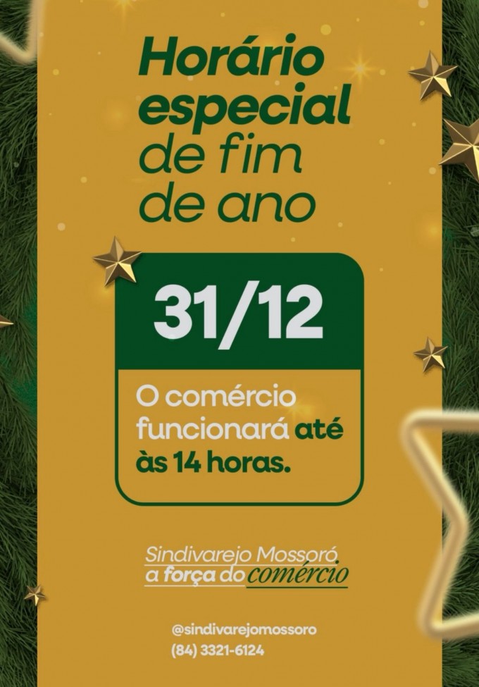 A informação é do Sindicato do Comércio Varejista de Mossoró (SINDIVAREJO Mossoró): comércio mossoroense funciona até às 14h deste dia 31 de dezembro, véspera do ano novo.