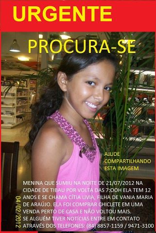 Desapareceu sábado (21), por volta de 7h, em Tibau (42 quilômetros de Mossoró), uma criança de nome Cíntia Lívia, filha de Vânia Maria de Araújo.
