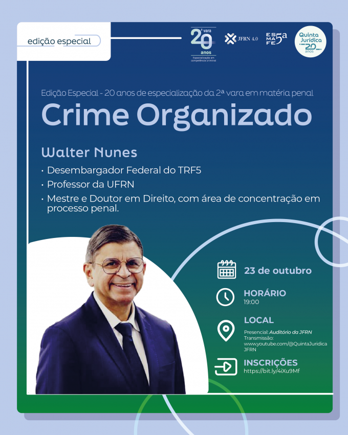 A Quinta Jurídica é promovida pela Escola de Magistratura Federal no Rio Grande do Norte (ESMAFE/RN). O evento da próxima semana é especial por ser celebrativo aos 20 anos de especialização da 2ª Vara em matéria criminal.