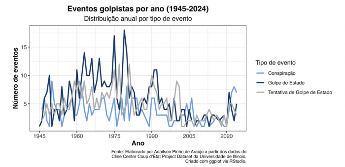 Para compreender como esses eventos se distribuíram historicamente, é útil observar o padrão anual global de conspirações, tentativas e golpes consumados. O gráfico abaixo apresenta essa distribuição entre 1945 e 2024, a partir dos dados do Cline Center.