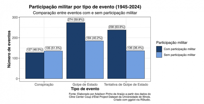 Após observar a evolução histórica dos eventos golpistas ao longo do tempo, é possível examinar um aspecto específico que ajuda a compreender quem participa dessas ações. O gráfico seguinte compara a presença ou ausência de participação militar em conspirações, golpes consumados e tentativas no mesmo período do gráfico anterior.